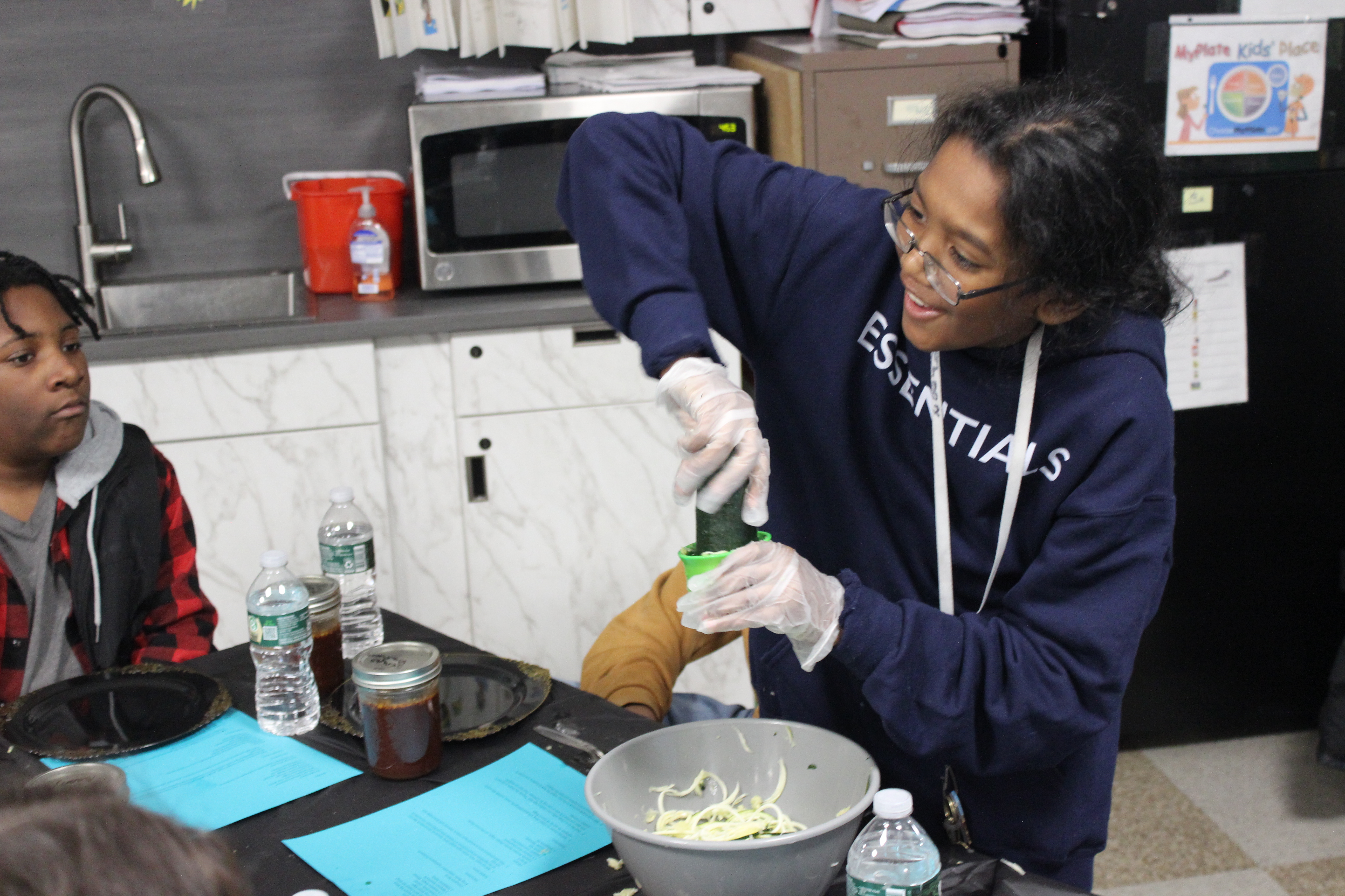 They also learned how to make their own whipped cream and watched as the various chefs and Community Schools staff prepared the other elements of the meal they would soon eat – rice and zucchini noodles, quinoa, pan-seared chicken, broccoli and – for dessert with that whipped cream – apple crisp. Some of the students had the chance to make their own zucchini noodles – or zoodles – using a spiralizer.