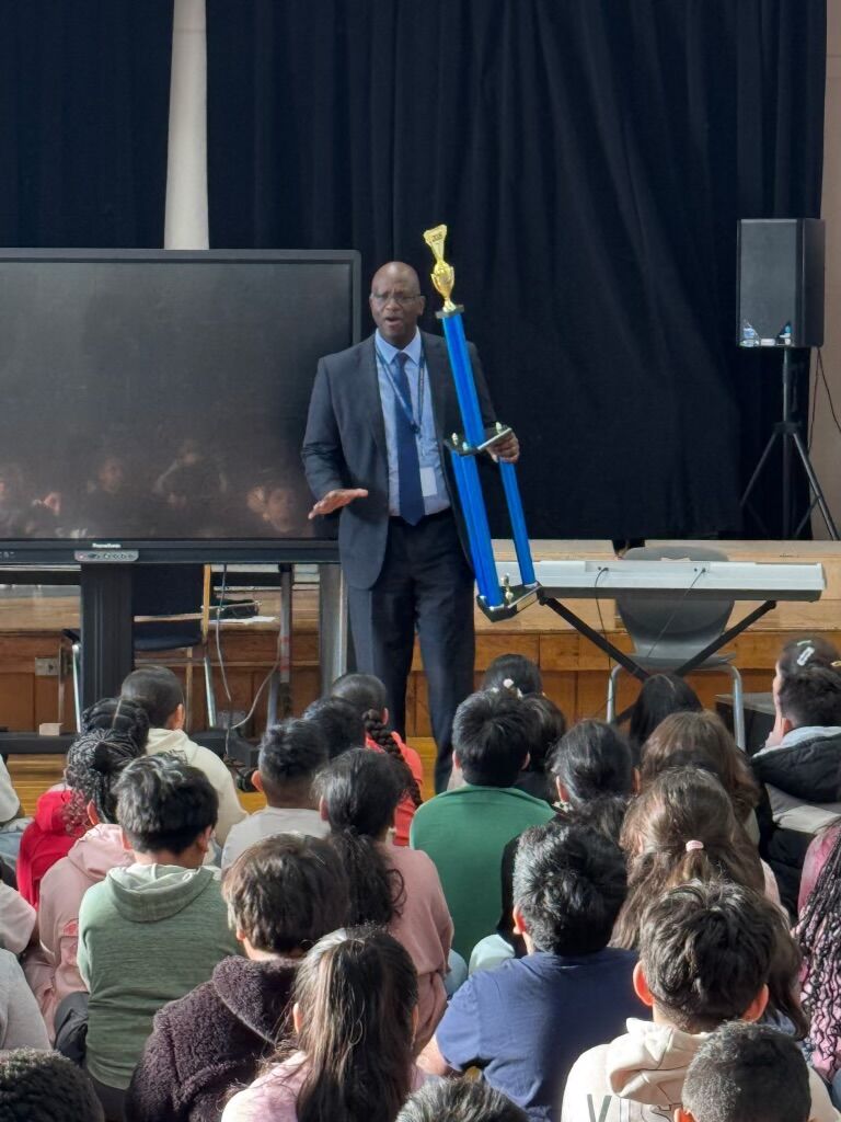 On Monday morning, the students gathered to be honored and receive the Monthly Literacy Leader trophy, an enormous traveling award that will live in the school that reads the most minutes-per-student each month during the challenge.