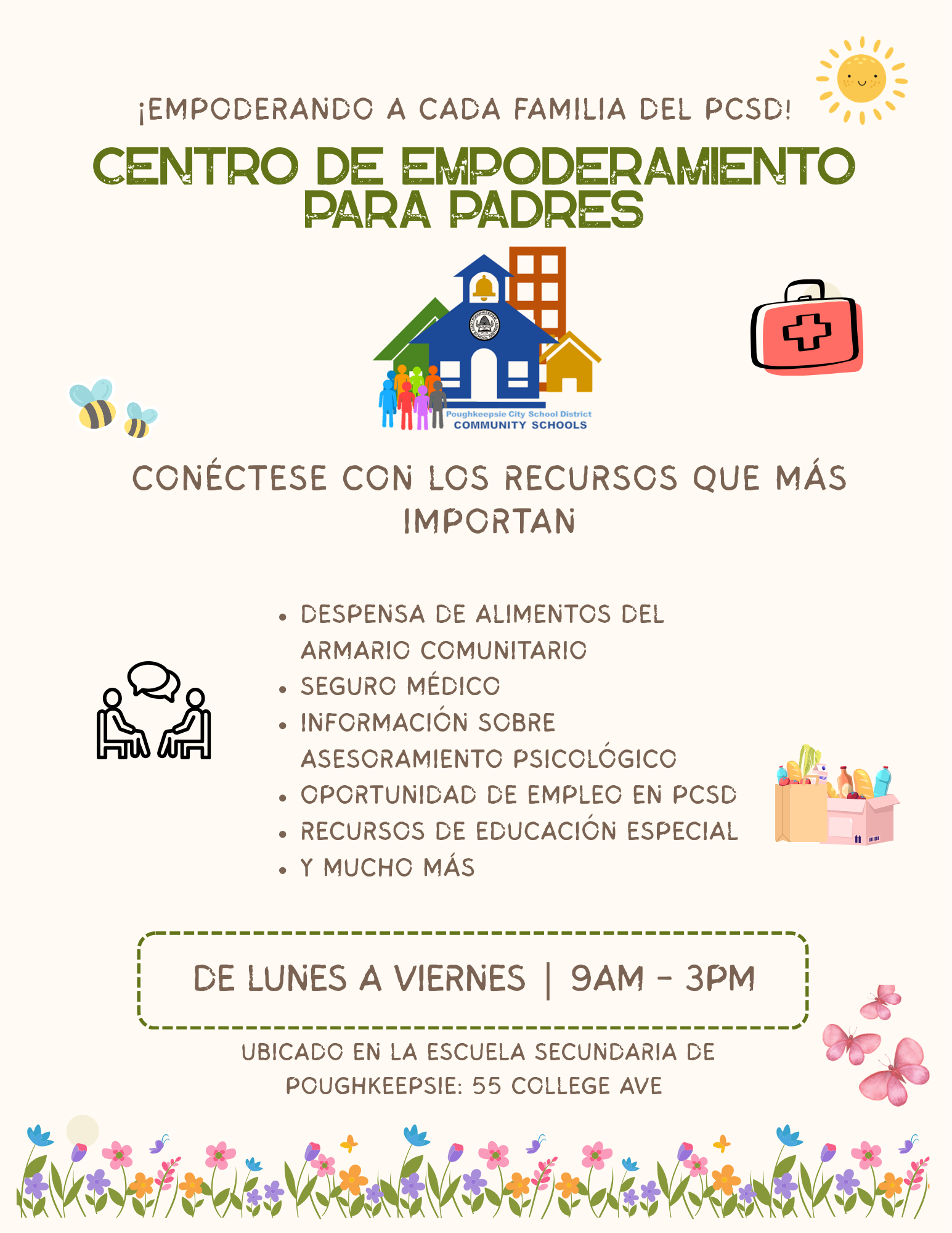 Estamos comprometidos a empoderar a cada familia del PCSD proporcionándoles los recursos que más necesitan. Les invitamos a visitar el Centro de Empoderamiento para Padres (Parent Empowerment Center), ubicado aquí mismo, en la Poughkeepsie Middle School. Ya sea que necesiten ayuda con la inscripción escolar, busquen recursos comunitarios o simplemente deseen involucrarse más en la educación de sus hijos, nuestro centro está aquí para brindarles apoyo.
