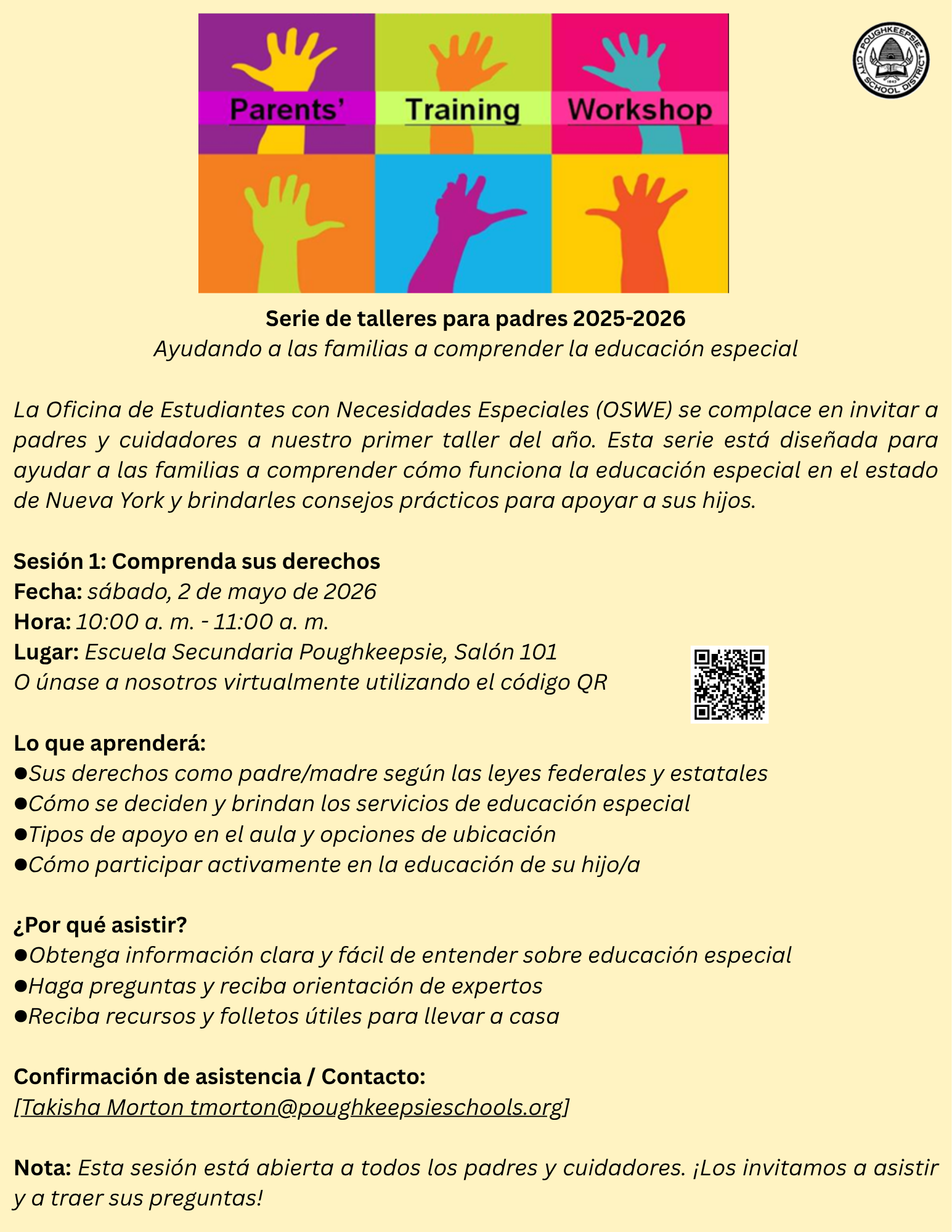 Les invitamos a nuestro Taller para Padres sobre Educación Especial, que se llevará a cabo el sábado 2 de mayo, de 10:00 a 11:00 a. m., en la Poughkeepsie Middle School, ubicada en 55 College Ave. (Salón 101). Hablaremos sobre sus derechos como padres, el proceso de determinación de los servicios y las formas en que pueden apoyar el aprendizaje de sus hijos. Todos los padres y cuidadores son bienvenidos; les animamos a traer sus preguntas. Por favor, confirmen su asistencia.