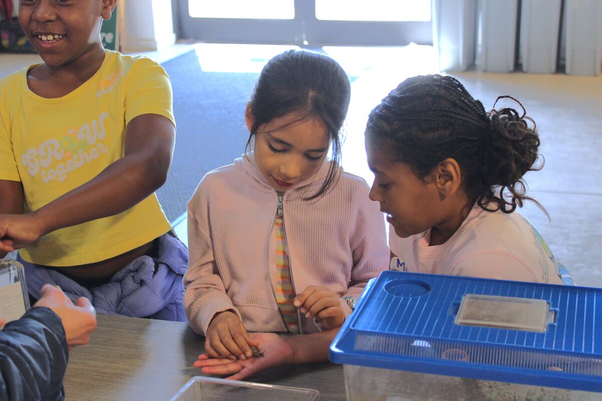 During the field trip, the students put those skills to use through a variety of activities that included a hike with a “nature bingo” hunt, observing by the side of a pond, exploring the preserve’s “Learning Forest,” and a trip inside the barn to look at items through microscopes and touch small creatures. The students also enjoyed a snack and story time in an outdoor classroom space, had the option to relax in hammocks, and thrilled in a sprint across Vassar’s rugby field.
